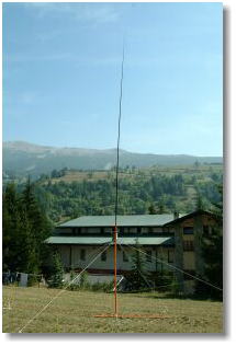 Come antenna ho adottato lo stesso sistema che avevo sperimentato al DX Camp di primavera a Borgio Verezzi: tubi di PVC aragosta per impianti idraulici e canna da pesca in vetroresina. Non mi dilungo in spiegazioni idrauliche o ittiche visto che dalle foto allegate si evince che sopra un tubo di 3 metri di PVC era issata una canna da pesca di 9 metri, mentre un ulteriore pezzo di tubo di circa un metro faceva da colletto e rinforzo tra i due; alla cima della canna era assicurato un filo elettrico che dalla cima fino alla base del sistema misurava esattamente 12 metri. Alla base del tutto stava una lamiera zincata di ben mezzo centimetro di spessore (gentilmente regalata da Carlo Sobrito, quello del Premio Boselli, ve lo ricordate?) a cui era stato saldato un manicotto cilindrico che facesse da supporto al palo di PVC. Verso la cima del tubo di PVC erano stati praticati dei fori per tenere degli anelli ai quali connettere degli stralli (assolutamente necessari visto che a Cesana il vento si alza alle 10 del mattino e cala solo verso le 18 di sera, almeno in questa stagione).