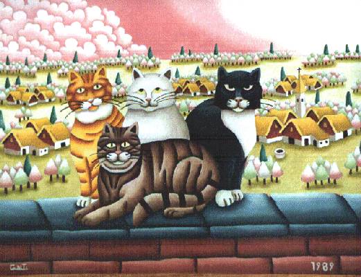 Franco Conti: "I gatti di Cristina", 1989 olio su cartone telato, cm 40x30 Collezione privata