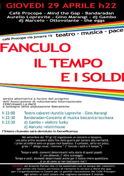 IL TEMPO E I SOLDI piccola manifestazione alternativa (Teatro-Musica-Pace) La serata, organizzata a favore di Cerchiamo la Pace, vuole essere un aiuto concreto a chi ancora opera nelle zone della ex Jugoslavia, terreno di passati conflitti, ora di lenta ricostruzione.