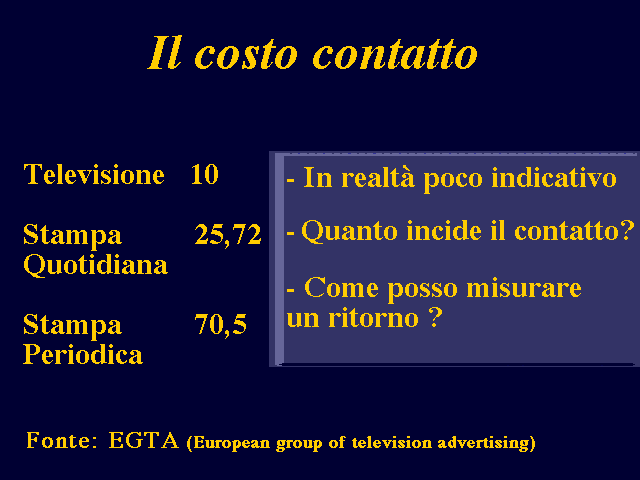 Con riferimento alla tabella sottostante, se si pone costo 10 per la TV e si opera un confronto tra questa e gli altri mezzi, si nota come il costo contatto sale notevolmente se ci si pone di fronte alla stampa quotidiana ed, ancor di più, a quella periodica.