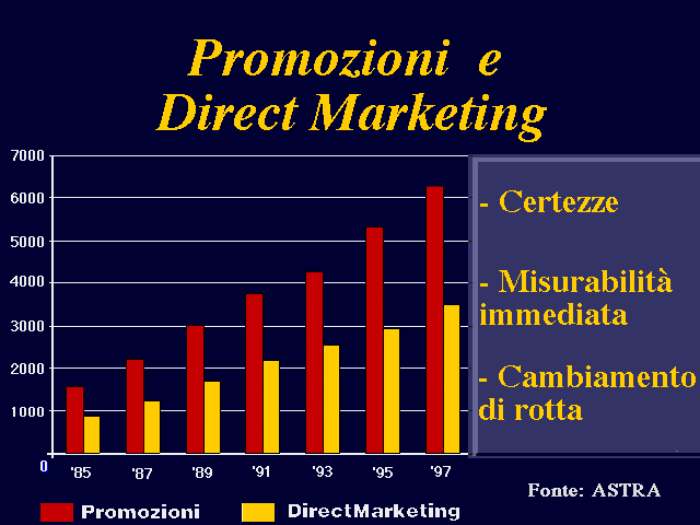 In riferimento al grafico precedente, sempre estrapolato in termini di dati dallo studio citato di Astra-Intermatrix, si osservi il trend degli investimenti in promozioni (sconti, regali, concorsi, ecc.) ed in direct marketing (direct mail, direct response, telemarketing). Questi mezzi, secondo gli specialisti, sono in costante crescita e, sempre a loro detta, quadruplicheranno il loro valore nel periodo 1985-1997.