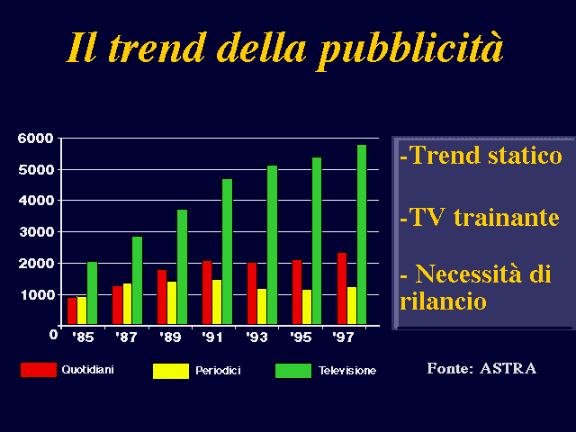 Il punto di partenza per l'esame di ciò che sta accadendo nell'ambito pubblicitario classico è il grafico qui riportato. In esso, tratto da uno studio Astra-Intermatrix sul futuro della pubblicità, è rappresentato il trend degli investimenti del settore per il periodo 1985-1997, investimenti effettuati su quotidiani, periodici e televisione.