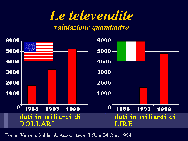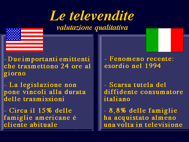 Lo scenario finora delineato lascia trasparire una crescente integrazione tra gli strumenti, nonché un arricchimento nei mezzi per la comunicazione commerciale. Su questo sfondo, a completamento ed a conferma di ciò che è stato appena affermato, si inseriscono forme inedite per il nostro mercato come le televendite. A dimostrazione del fatto che il settore delle televendite in Italia è in fase d'introduzione, è interessante analizzare compara-tivamente il panorama statunitense e quello del nostro paese sia dal punto di vista qualitativo che da quello quantitativo (cfr. le rispettive tabelle nelle pagine seguenti). Sotto il primo aspetto, negli USA si possono osservare abbastanza chiaramente tre elementi: