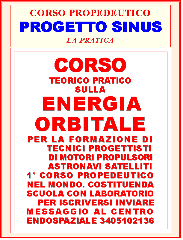 TENTATIVO DI LANCIO DI SATELLITE ARTIFICIALE IN ORBITA SINUSOIDALE ........... omissis ........... omissis ........ .................................. pagina in costruzione ........................ INDICE DI DIFFICOLTA' ALTISSIMO. TUTTAVIA I CALCOLI E IL LAVORO SPERIMENTALE FINORA EFFETTUATI NE INDICHEREBBERO LA POSSIBILITA'. |