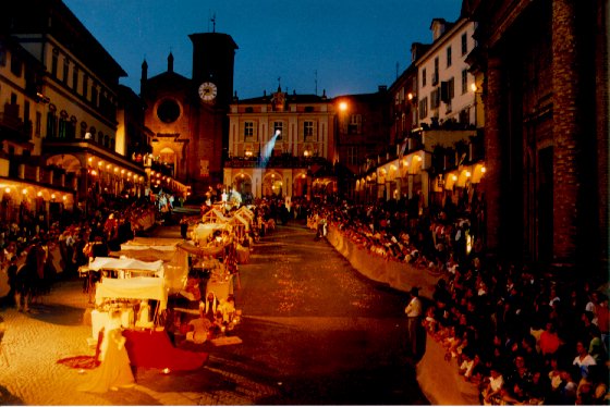 La piazza viene addobbata in modo medievale per accogliere circa 200 invitati. Tutti i particolari sono curati in modo da creare l' atmosfera per osservare : menestrelli, trovator cortese, mangiafuoco, giocolieri, danzatrici, maghi ecc..