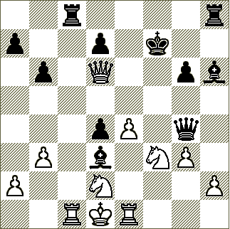 14...Aa6 15 Db3?! Il Bianco continua a non sviluppare i pezzi. Meglio 15 Ca3 Dc6 16 Db3 Re8 17 Db4 con approssimativa parità. 15...Ac4 16 Da3 Dopo 16 Ce5!? Ae5 17 Ae5 De5 (17...d6? 18 Df3 Re6 19 Ah8 Th8+-) 18 Dc4 d5! 19 De2 de4 20 Cc3 si giungerebbe in una posizione di difficilissima valutazione.16...Cc6 Avrebbe portato ad un gioco incerto il seguito 16...d5 17 Ab4 de4 18 Cg5 Re8 19 Cd2 Ad5 20 Cde4 Cf5. 17 b3 Ad3 18 Cbd2 Cd4 19 Ad4 (19 Cd4 Dc3±) 19...ed4 20 Tc1? Ora le case nere sono deboli e la Donna ha validi ingressi. Teneva ancora 20 g3. 20...Df4 21 Rd1 Tac8 22 Te1 Ah6 23 g3?! Bisognava tentare 23 Da7 permettendo la penetrazione dei pezzi neri ma trovando contro gioco sul Re avversario. Per esempio: 23...Tc1 24 Rc1 Tc8 25 Rb2 Tc2 26 Ra1 Dd6 27 e5 Ad2 28 Cd2 Dc6 29 e6 Rg8 30 Cc4 con chances tattiche. 23...Dg4 24 Dd6?? (vedi diagramma) Resisteva ancora 24 h3 col possibile seguito 24...Dg3 25 Tg1 Tc1 26 Dc1 Dh3 27 Ce5 con vantaggio del Nero. Il tratto del testo prende matto in due. Certo non è facilissimo pensare alla prossima mossa del Nero però non è neanche così strana essendo la posizione molto tattica. 24...Df3 25Cf3 Tc1 1-0
